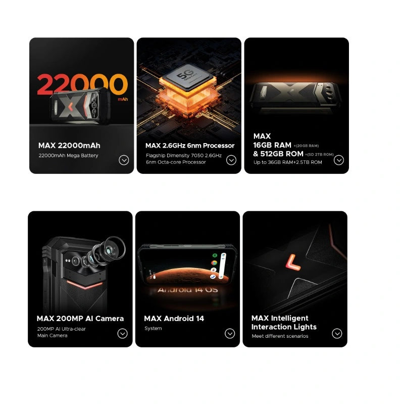 Teléfono inteligente resistente DEEGOO Vmax Plus 5G, 200 MP, 22 000 mAh, 36 GB (16 + 20) + 512 GB