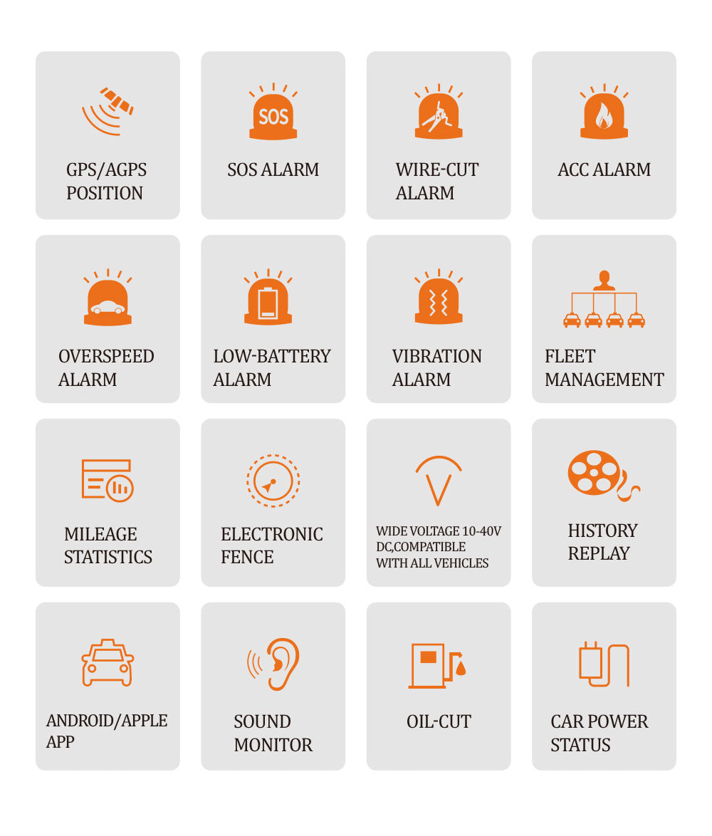* SOS alarm, Speeding alarm, ACC alarm, Shock alarm