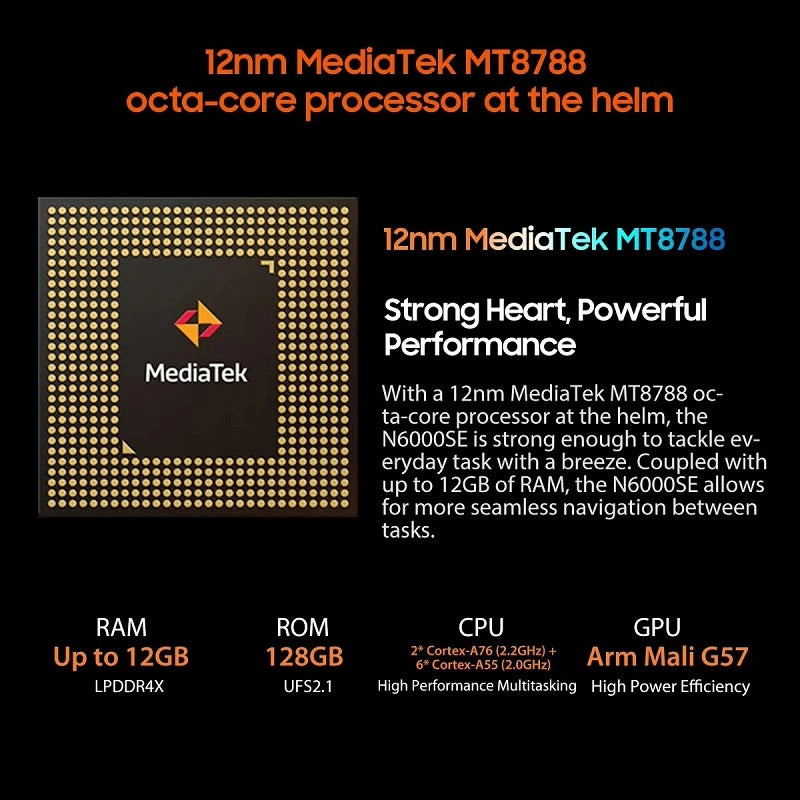 1. CPU: MediaTek MT8788, Octa-core, 4 x Cortex-A73 2.0GHz; 4 x Cortex-A53 2.0GHz